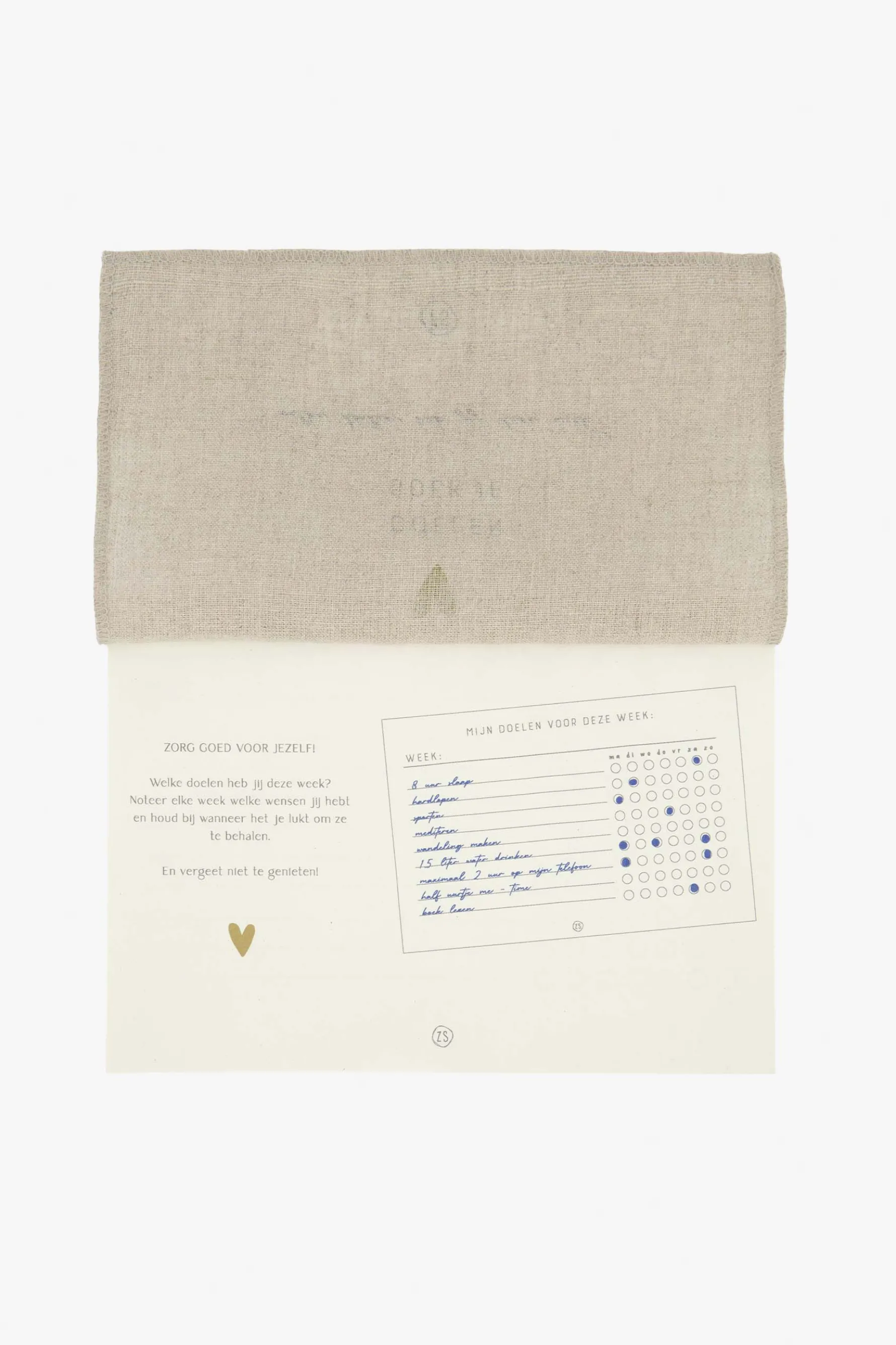 Zusss doelenboekje zand|Dit doelenboekje van Zusss helpt om orde te krijgen in de chaos. Hoe fijn is het om je wekelijkse doelen overzichtelijk op een rijtje te hebben staan! De voorkant van dit boekje is gemaakt van linnen met daarop de titel en de vraag: welke doelen heb jij deze week? Het formaat van dit boek is 21×15 centimeter. Tip: neem een kijkje bij de Zusss spullen voor in huis!|Zusss: basic, stoer, uniek en een tikkeltje eigenwijs.
