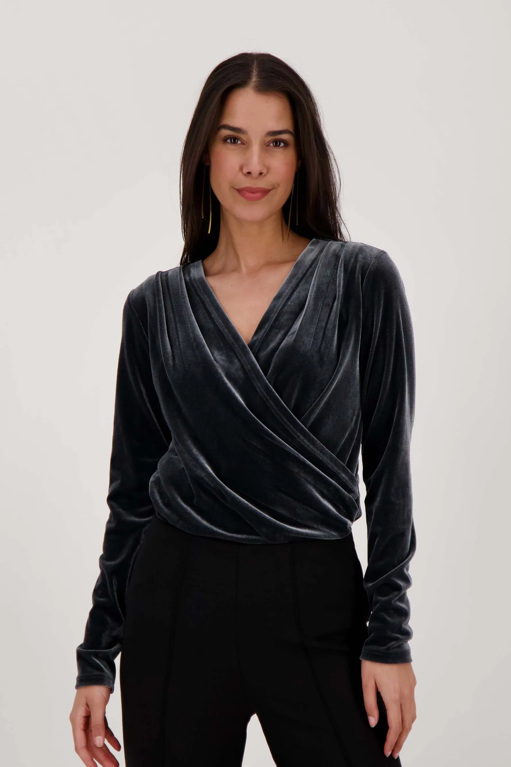 Zusss fluwelen wikkeltop antracietgrijs|Jaa deze wil je hebben! Deze fluwelen wikkeltop van Zusss zit zoo fijn! Combineer ´m met een fluwelen broek of een fijne Zusss jeans. Met dit item is alles mogelijk! De top heeft lange mouwen en een wikkel aan de voorkant. De top is gemaakt van 92% polyamide en 8% elastaan. Kijk ook eens bij de Zusss mooimakersom je outfit af te maken.|Zusss: basic, stoer, uniek en een tikkeltje eigenwijs.