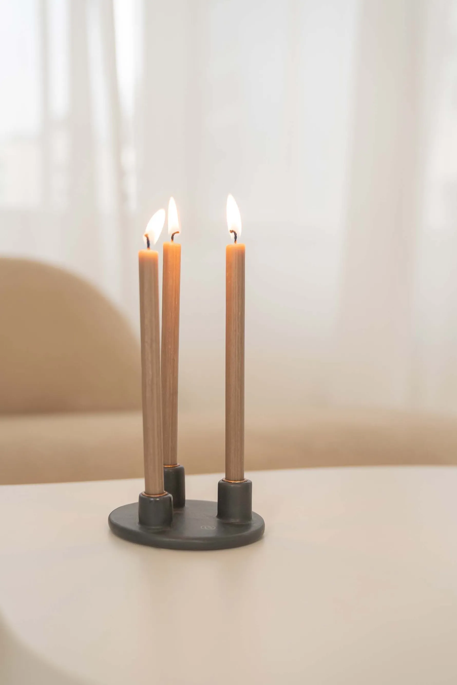 Zusss ronde kandelaar keramiek|Met deze kandelaar waarin 3 smalle kaarsjes van Zusss passen heb je meteen een leuk sfeertje in je huis. De drie openingen voor de kaarsen verschillen onderling in hoogte waardoor er een leuk speels effect ontstaat. In dit kandelaartje passen de smalle Zusss kaarsen van 17cm , deze worden in doosjes van 10 stuks verkocht. Het Zusss logo staat afgebeeld op het ronde schaaltje. De kleur van de kandelaar is antracietgrijs wat erg leuk te combineren is met de verschillende kleuren smalle kaarsjes. De kandelaar is 10 cm doorsnede.|Zusss: basic, stoer en een tikkeltje eigenwijs.