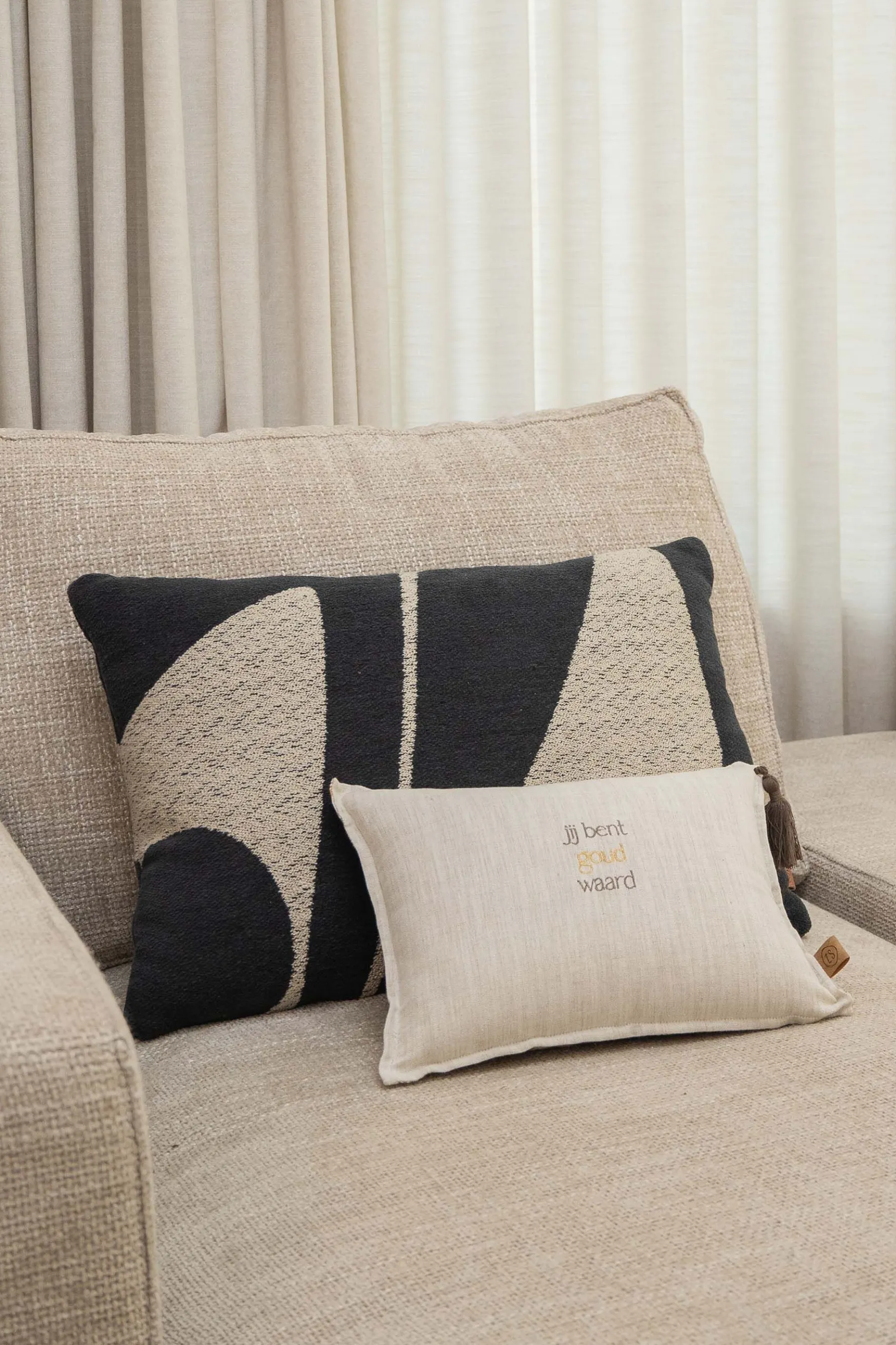 Zusss kussen grafisch element 60x40cm antraciet|Kleur buiten de lijntjes met dit speelse Zusss kussen. Wat een gave print! Op het kussen staat een grafisch element in de kleur antraciet. Het kussen is gemaakt van 50% polyester en 50% katoen. Het Zusss logo vind je terug op het PU labeltje aan de zijkant. Het formaat van het kussen is 60×40 centimeter. Neem ook een kijkje bij de andere Zusss kussens ! Welke kussens geven jou een glimlach op je gezicht?|Zusss: basic, stoer, uniek en een tikkeltje eigenwijs.