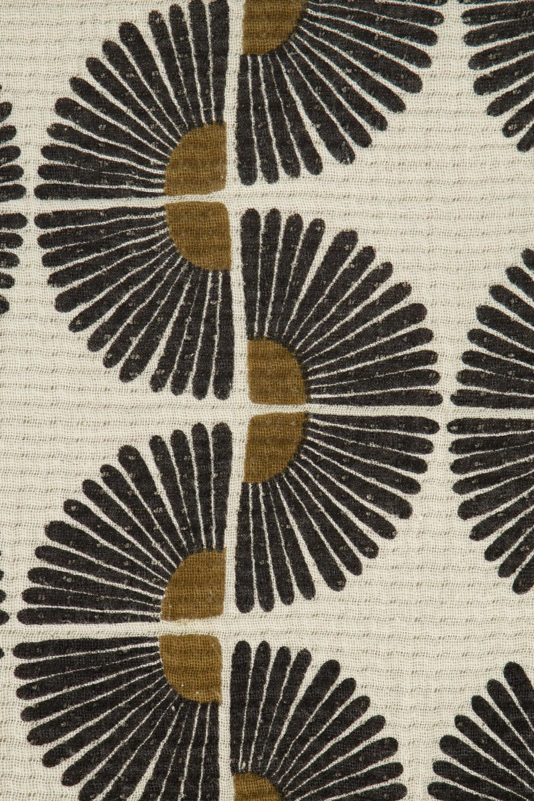 Zusss plaid waaiers 130x170cm zand/antraciet/oker|Fijne dekentjes komen altijd van pas! Je kruipt er lekker onder op de bank of voor de koutkachel in de tuin. Dit zandkleurige Zusss plaid heeft een speelse print met waaiers in de kleuren antraciet en oker. Het formaat van het plaid is 130×170 centimeter en deze is gemaakt van 100% katoen. Het Zusss logo vind je onderaan in de rechter hoek. Een stapel Zusss kussens erbij en jij komt die bank niet meer af. |Zusss: basic, stoer, uniek en een tikkeltje eigenwijs.