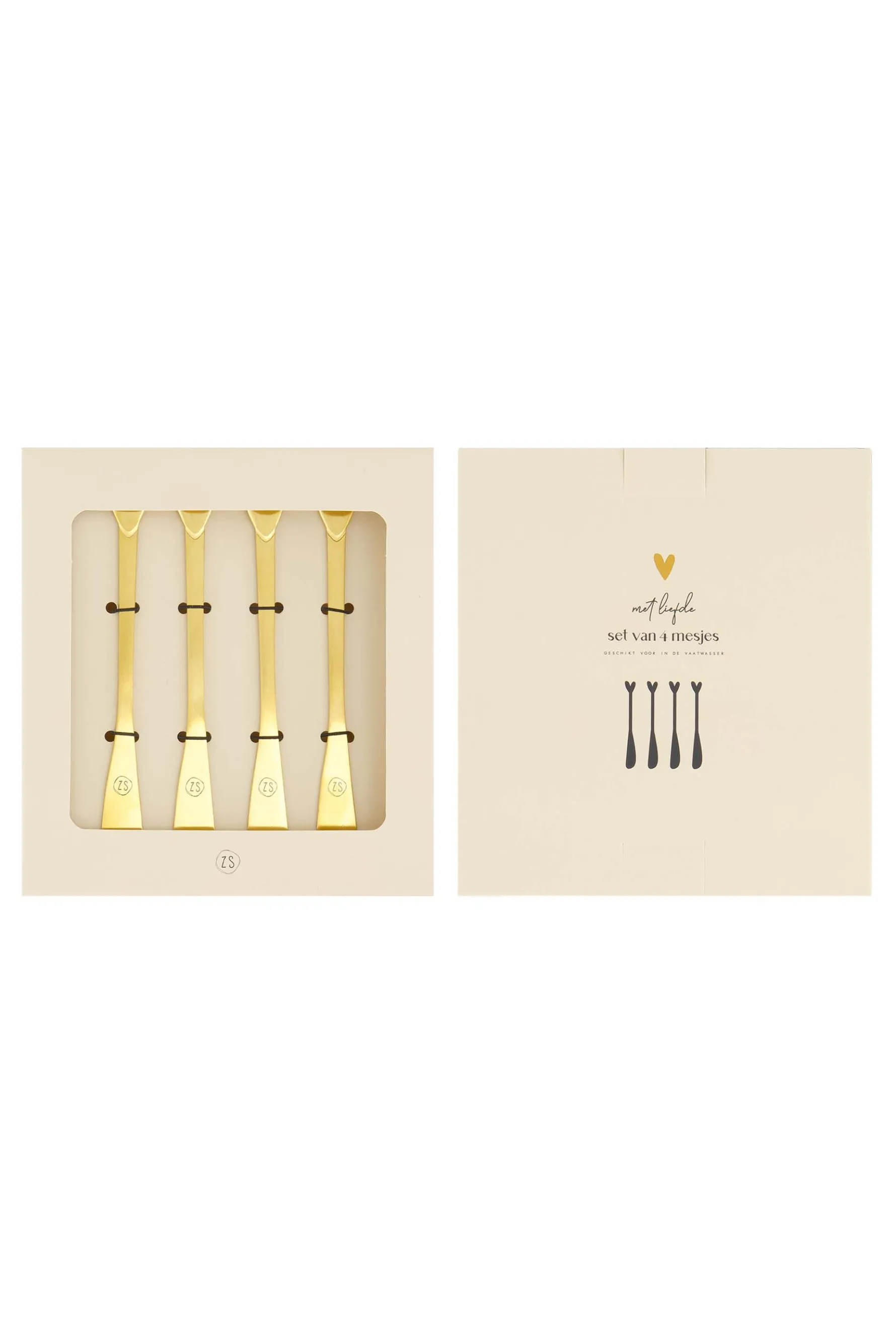 4 gouden mesjes met hartje|Wat een cuties, deze messen met hartjes. Ze maken je borrelmoment in het weekend nóg gezelliger. Superleuk voor kaas of lekkere smeersels. De gouden messen zijn onderdeel van een grotere set met vorkjes en lepeltjes, die vind je tussen het andere Zusss bestek. De mesjes zijn gemaakt van metaal. De mesjes kunnen mee in de vaatwasser, al heeft handwassen de voorkeur om de kwaliteit optimaal te houden.|Zusss: basic, stoer, uniek en een tikkeltje eigenwijs.