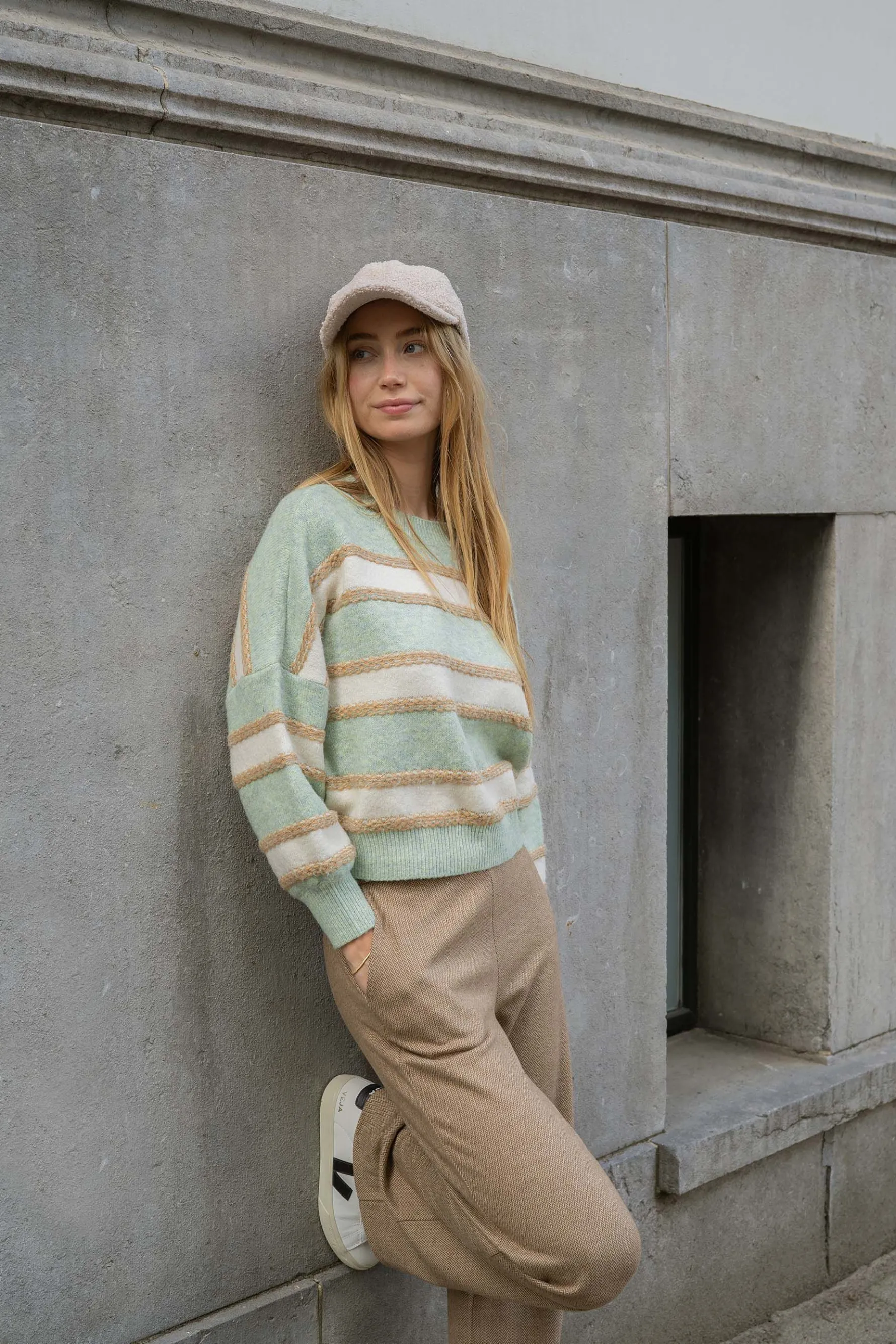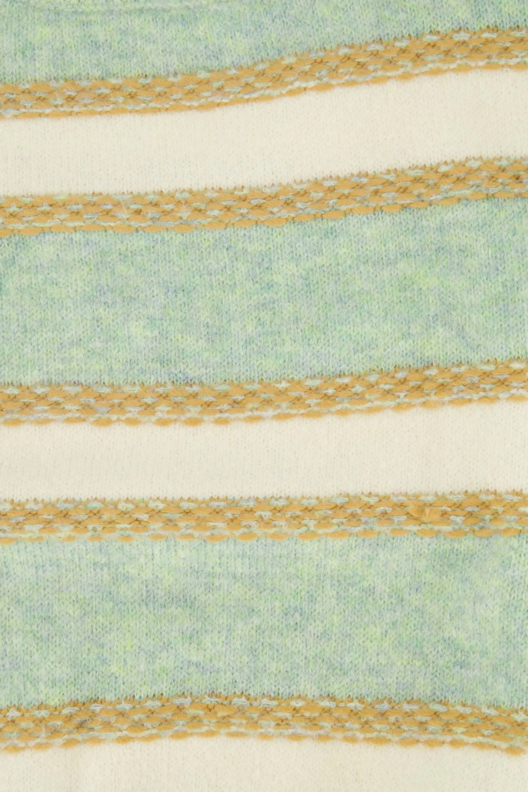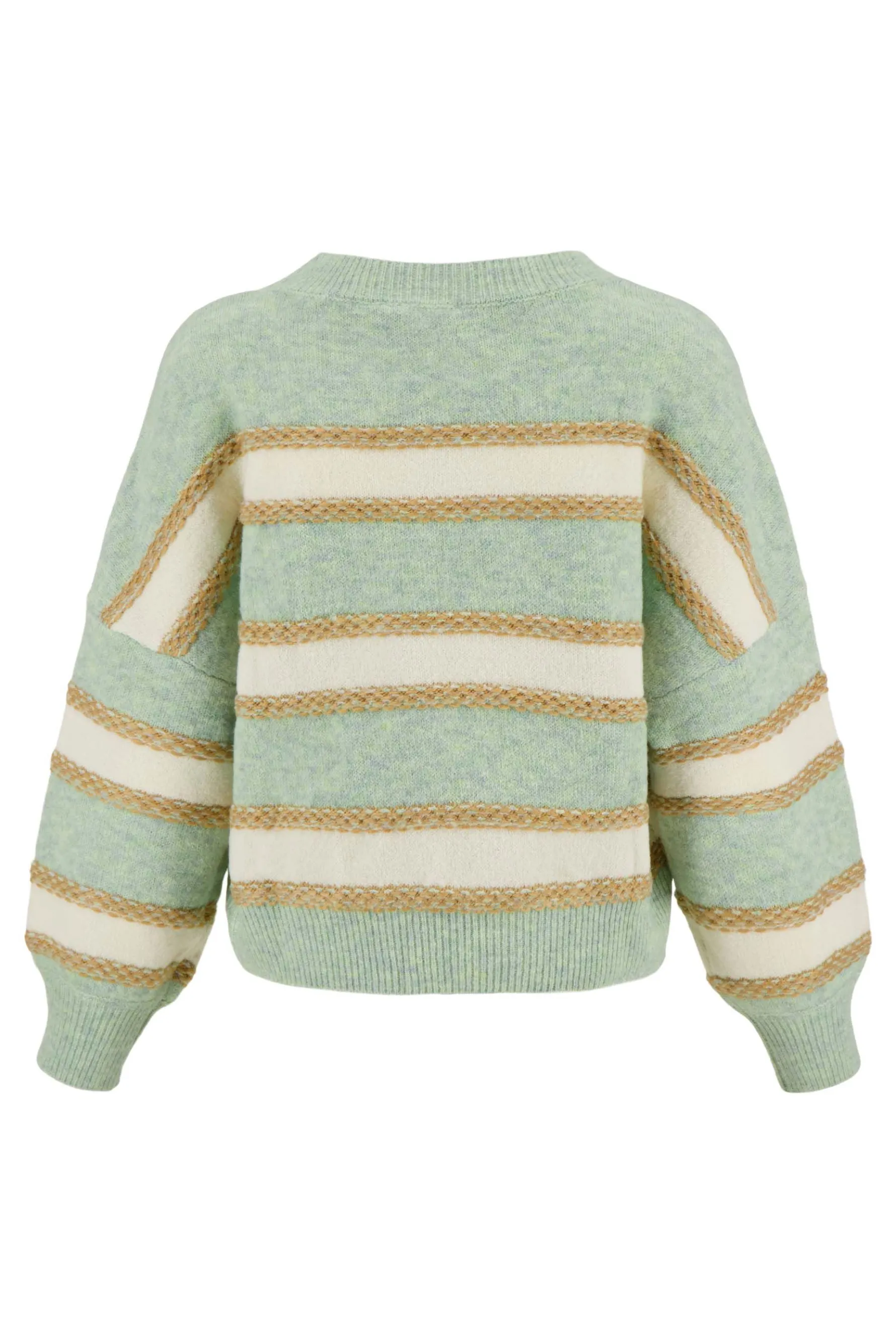 Zusss trui met strepen mint|Een zachte fijngebreide trui van Zusss. Met deze gestreepte trui kun je alle kanten op! Draag ‘m met een relaxte outfit voor een avondje op de bank of op een Zusss jeans voor een dagje uit. Heb jij al een gelegenheid in gedachten? De trui heeft lange mouwen en is gestreept in de kleuren: mint, crème en goud. Dit item is gemaakt van 47% acetaat, 22% nylon en 20% wol. Vergeet niet om een kijkje te nemen bij de rest van het Zusss kleding assortiment. Welk item combineer jij met deze trui?|Zusss: basic, stoer, uniek en een tikkeltje eigenwijs.