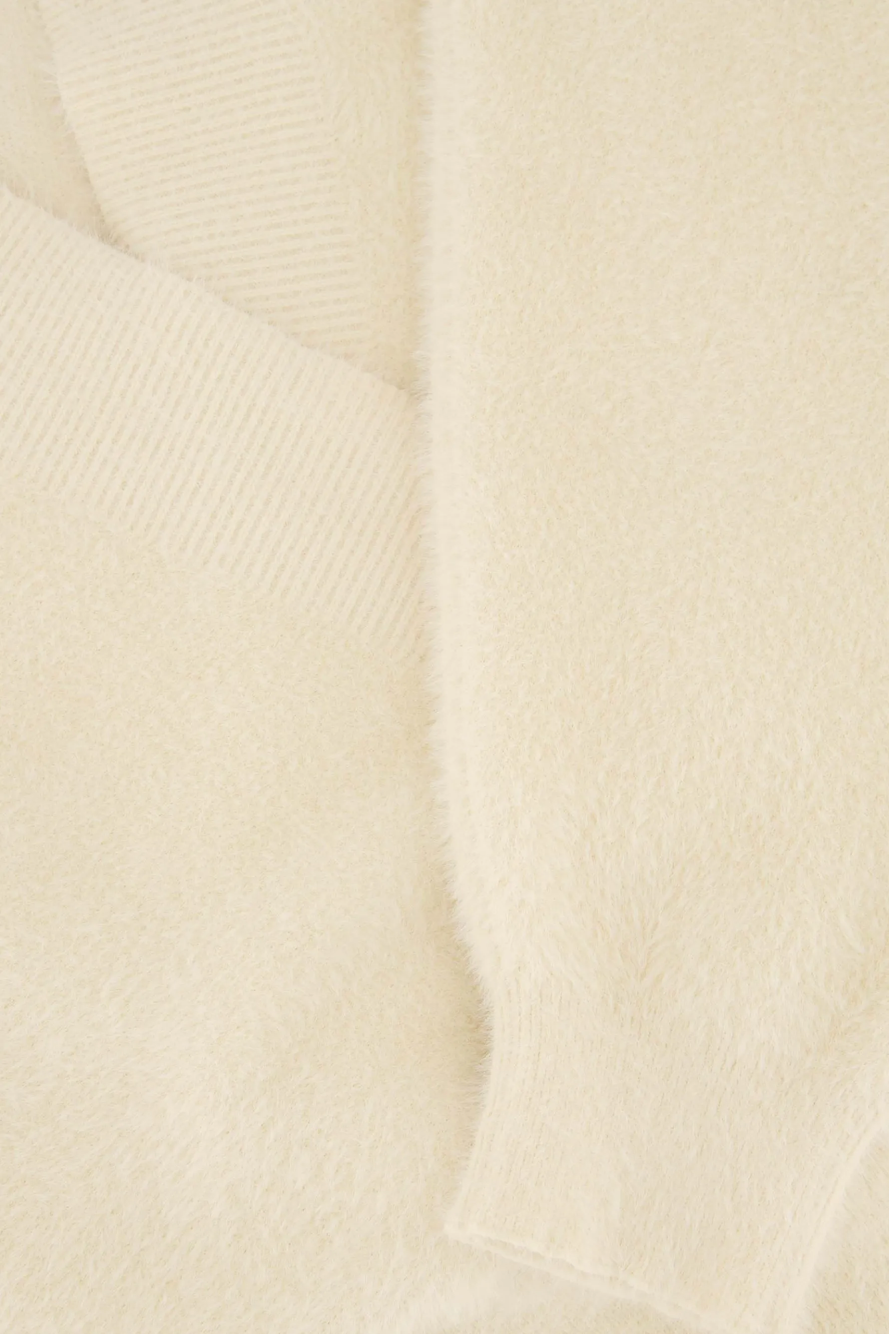 Zusss wikkeltrui in fluffy garen|Jaa deze wil je hebben! Een zachtje Zusss trui is altijd fijn. Met deze creme kleurige trui kun je alle kanten op. Je draagt ‘m op een gekleurde broek of fijne jeans van Zusss. De overslag en de ballonmouwen maken ‘m lekker uniek en speels. Deze leuke trui is gemaakt van 50% viscose, 28% polyester en 22% nylon. Kijk ook eens bij de Zusss mooimakersom je outfit af te maken.|Zusss: basic, stoer, uniek en een tikkeltje eigenwijs.