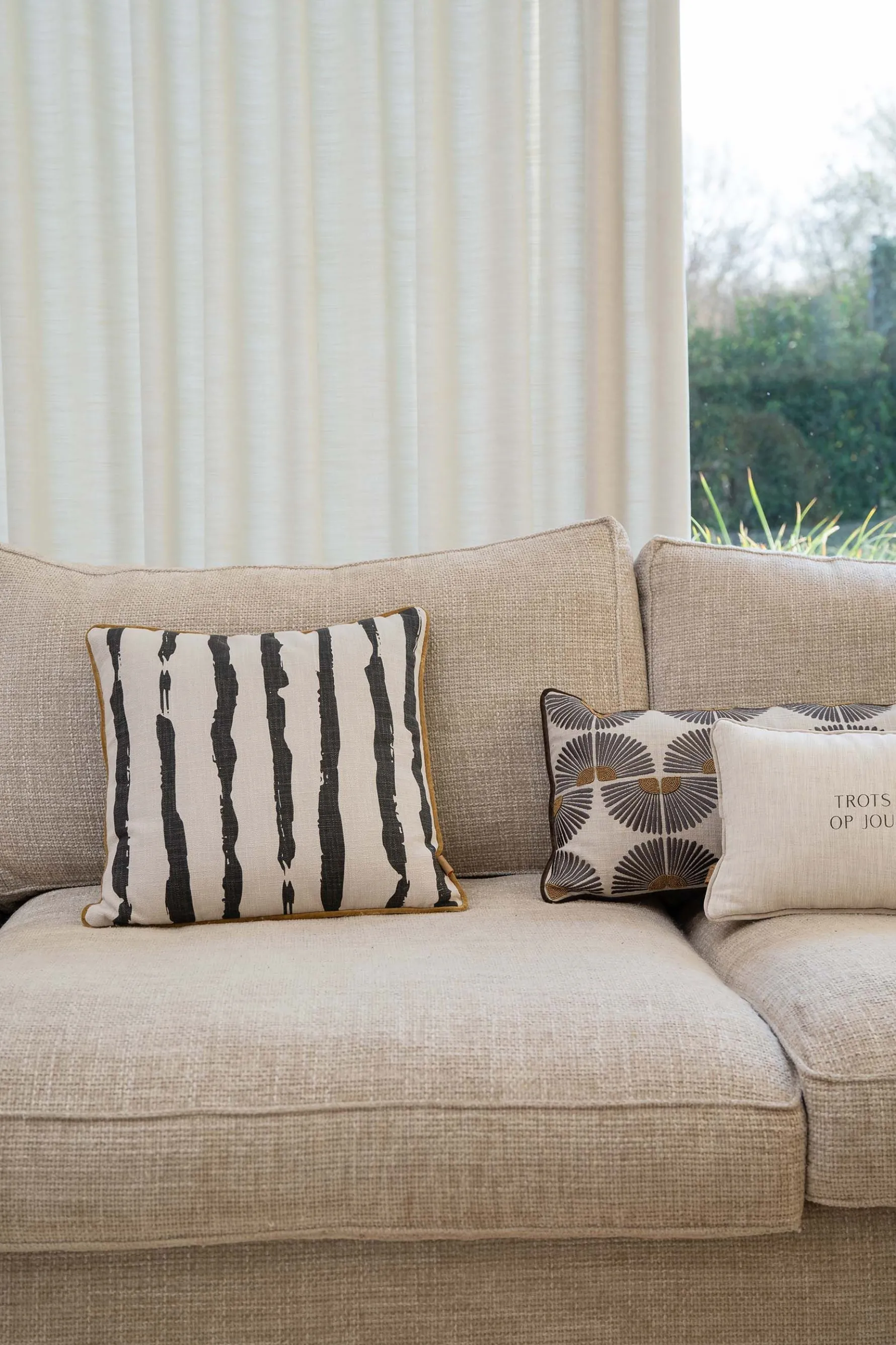 Zusss kussen penseelstreken 45x45cm zand/antraciet|Dit gestreepte kussen van Zusss maakt jouw stoel of bank direct gezellig! Het kussen is 45×45 centimeter en heeft een gouden randje. De basiskleur van het kussen is peper en zout en heeft antracietkleurige strepen op de voorkant. De acterkant van het kussen heeft een effen antracietkleur. Het kussen is gemaakt van 100% katoen. Het Zusss logo vind je terug op het PU label aan de zijkant. Neem ook zeker een kijkje bij de Zusss woonaccessoires ! Welke items zijn jouw favoriet?|Zusss: basic, stoer, uniek en een tikkeltje eigenwijs.